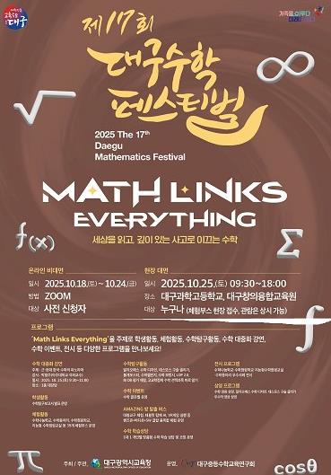 [메이저뉴스]대구시교육청이 주최하고 대구중등수학교육연구회가 운영하는 ‘제17회 대구수학페스티벌’이 10월 25일 9시 30분부터 대구과학고 및 대구창의융합교육원에서 'Math Links Everything(수학은 모든 것을 연결한다)'이라는 주제로 개최된다.