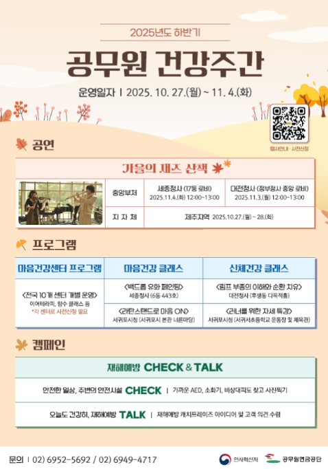 인사혁신처와 공무원연금공단은 공무원의 재해 예방과 건강한 공직문화 조성을 위해 세종, 대전, 제주지역 등에서 ‘2025 하반기 공무원 건강 주간 행사’를 27일부터 11월 4일까지 동시 진행한다고 24일 밝혔다.