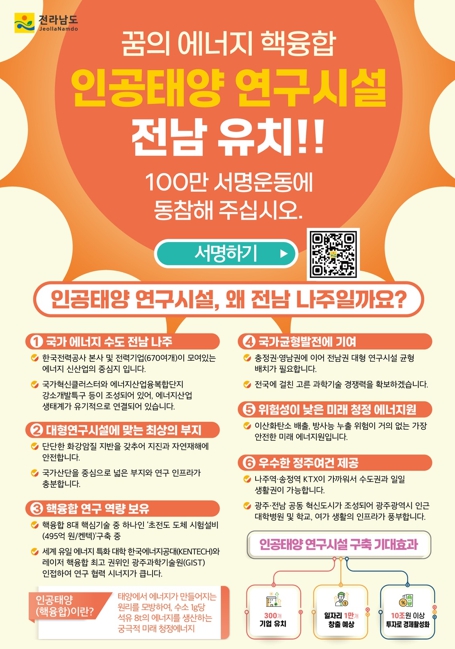 | ▲ 나주시가 인공태양 연구시설 유치를 위해 시민 서명운동을 진행하고 있다. 사진은 인공태양 연구시설 전남 나주 유치 서명운동 포스터. |