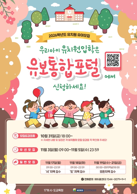 2026학년도 모집 대상은 2020년생부터 2022년생까지 출생한 유아로, 학부모는 유보통합포털을 통해 유치원 3곳에 지원할 수 있고, 2023년 1월~2월생은 희망하는 유치원에 문의 후 현장 접수를 통해 조기입학도 가능하다.