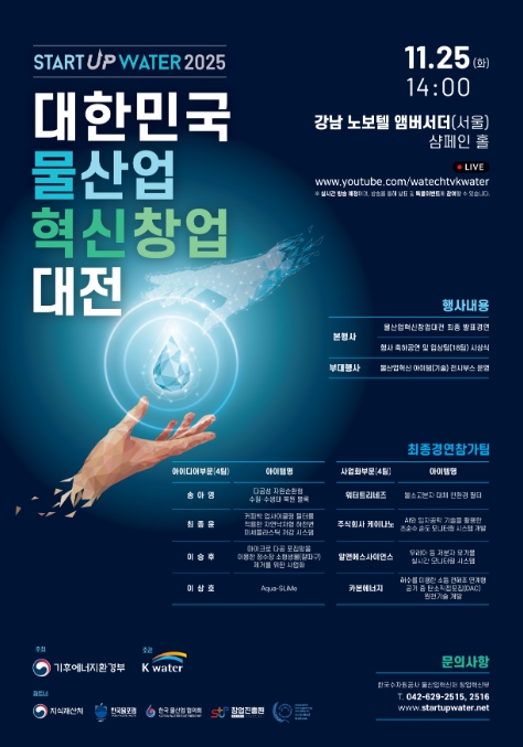 [메이저뉴스]기후에너지환경부와 한국수자원공사는 물산업을 우리나라의 새로운 성장동력으로 성장시킬 ‘혁신형 고성장 기업(유니콘)’을 발굴하기 위해 11월 25일 노보텔앰버서더호텔(서울 강남구 소재)에서 ‘대한민국 물산업 혁신 창업대전 2025’ 최종 경연을 개최한다고 밝혔다.