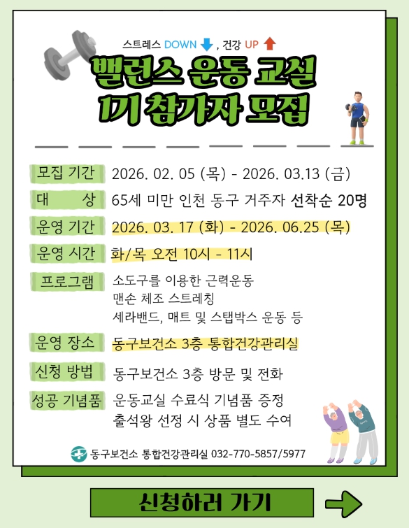 [메이저뉴스]인천 동구보건소는 지역 주민의 신체 균형 회복과 만성질환 예방을 위한‘밸런스 운동 교실’참여자를 모집한다고 밝혔다.