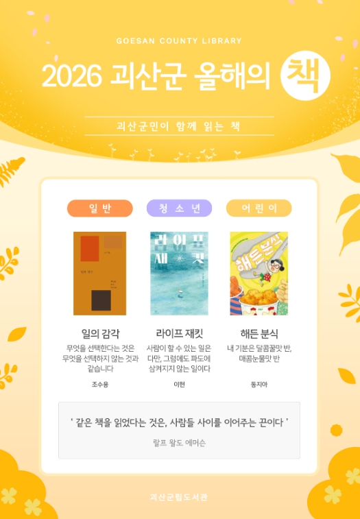 [메이저뉴스]충북 괴산군립도서관이 2026년 괴산군 올해의 책으로 일반, 청소년, 아동 분야 각 1권씩 총 3권을 최종 선정했다고 20일 밝혔다.
