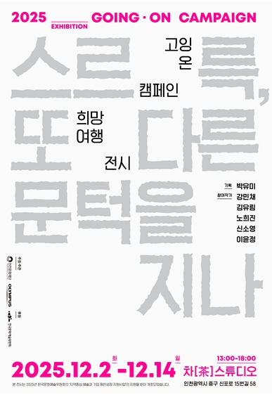 [메이저뉴스](재)인천문화재단은 암 경험자와 지역 예술가가 함께한 전시 '2025 고잉 온 캠페인 희망여행' ‘스르륵, 또다른 문턱을 지나’를 오는 12월 2일부터 14일까지 인천 중구 차(茶)스튜디오(인천 중구 신포로15번길 58)에서 운영한다고 밝혔다.