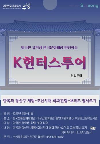 [메이저뉴스]대구 수성문화재단은 올해 2월부터 11월까지 대구·경북 외국인 유학생을 대상으로 한국문화체험 현장학습 ‘K헌터스 투어’를 운영한다.