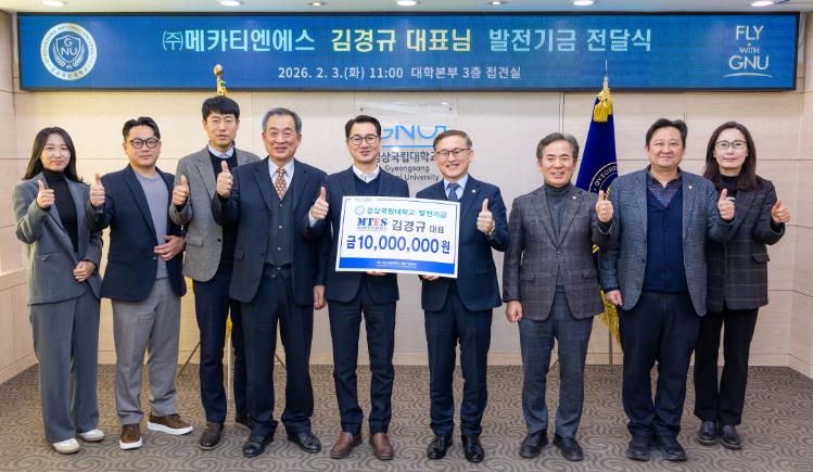 [메이저뉴스]경상국립대학교는 2월 3일 오전 11시 대학본부 3층 접견실에서 ㈜메카티엔에스 김경규 대표가 대학발전기금 1000만 원을 기부했다고 밝혔다.