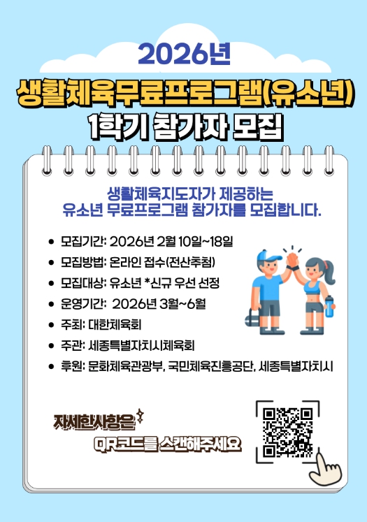 [메이저뉴스]세종특별자치시체육회는 세종특별자치시에 거주하는 유소년을 대상으로 「2026년 생활체육지도자 생활체육 무료교실 1학기」 참가자를 모집한다.