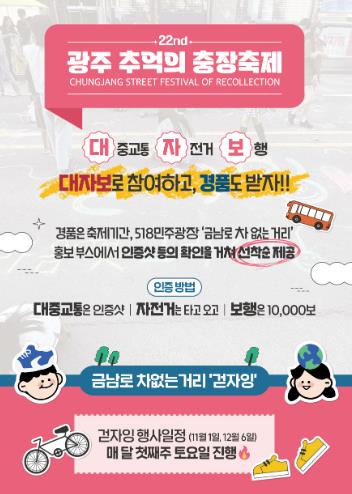 [메이저뉴스]광주 동구는 오는 15일부터 5일간 금남로와 충장로 일원에서 열리는 제22회 광주 추억의 충장축제에서 ‘금남로 차 없는 거리’의 가치를 알리고 대자보 도시 정책에 시민 참여를 확대하기 위한 특별 홍보 이벤트를 진행한다고 밝혔다.