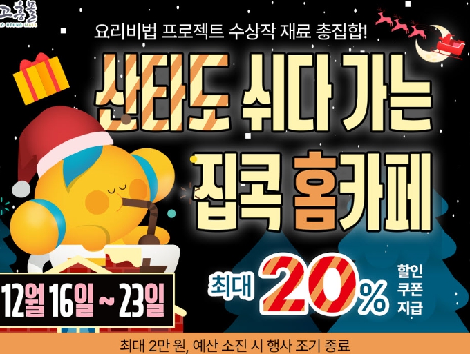 [메이저뉴스]고흥군이 운영하는 온라인 농수축특산물 쇼핑몰 ‘고흥몰’이 12월 16일부터 23일까지 겨울 홈카페 콘셉트의 특별 기획전 ‘산타도 쉬다 가는 집콕 홈카페’을 개최한다고 밝혔다.