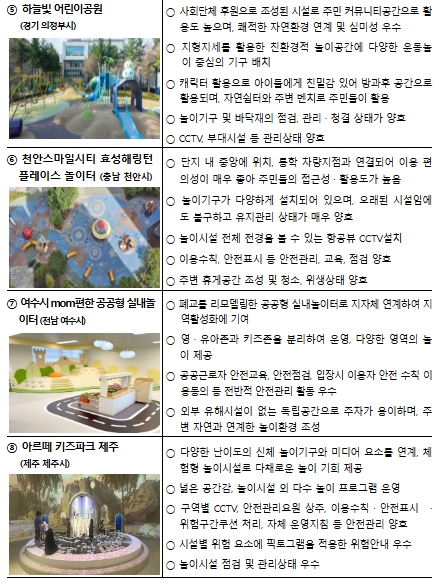 올해에는 전국 8만 4천여 개의 어린이놀이시설 중 시도 및 시도 교육청에서 추천한 46개 시설을 대상으로, 전문가·현장 심사*를 거쳐 최종 8곳을 선정했다.