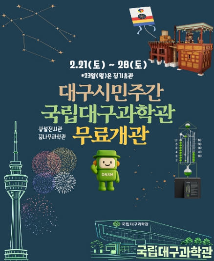 다만, 월요일인 23일은 국립대구과학관의 정기 휴관일로 무료 개관 대상에서 제외되며 해당 일에는 관람이 불가하다.