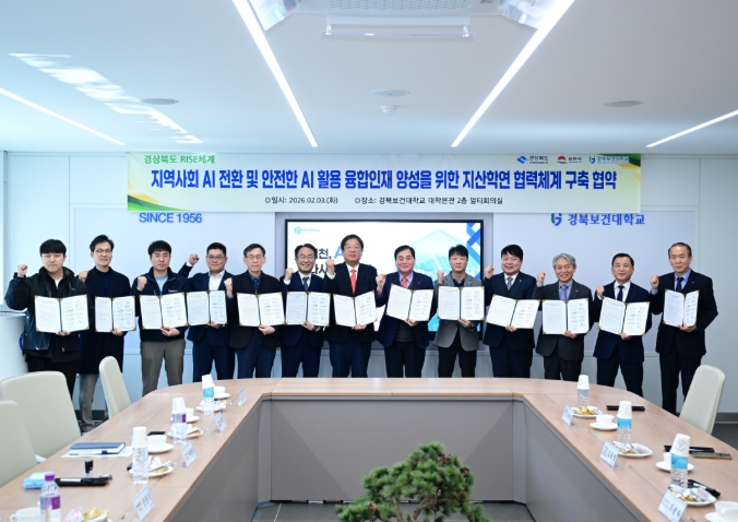 [메이저뉴스]김천시는 2월 3일 오전 11시, 경북보건대학교에서 '지역사회 AI 전환 및 AI 활용 융합인재 양성을 위한 지·산·학·연 협력체제 구축 협약'을 체결했다.