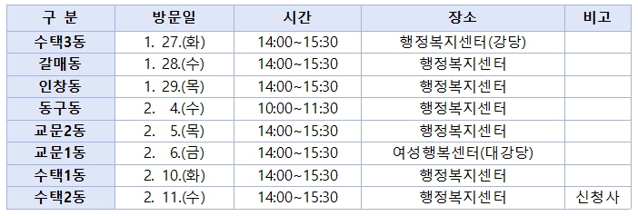 행사는 1월 27일부터 2월 11일까지 약 3주간 8개 동을 순차적으로 방문해 진행된다. 첫 일정은 1월 27일 수택3동에서 시작되며, 마지막 일정은 2월 11일 수택2동 신청사에서 마무리될 예정이다.