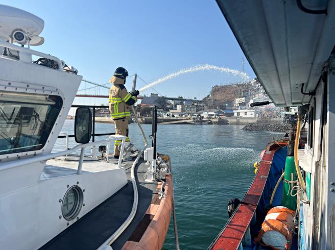 이번 훈련은 하동군 금남면 구노량항에서 집단 계류지 내 어선 화재 발생으로 인한 화재 진압, 익수자 구조를 전개로 한 시나리오로 진행됐다.