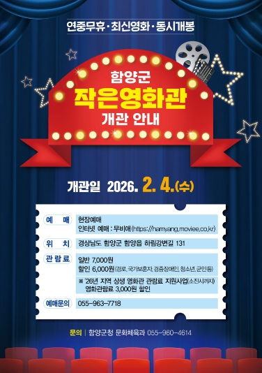 함양군 관계자는 “작은 영화관이 군민의 일상 속 쉼터이자 세대를 잇는 문화공간이 되길 기대한다”라며, “앞으로도 군민이 체감할 수 있는 문화 인프라 확충에 힘쓰겠다”라고 말했다.