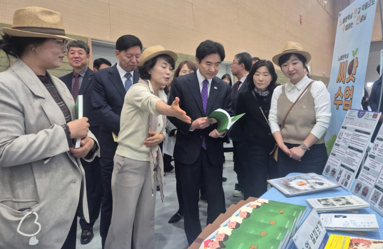 | ▲ 김대중 전남교육감이 22일 열린 ‘2030 유‧초등 수업한마당’에 선보인 ‘노벨문학상 씨앗수업’을 살펴보고 있다. |