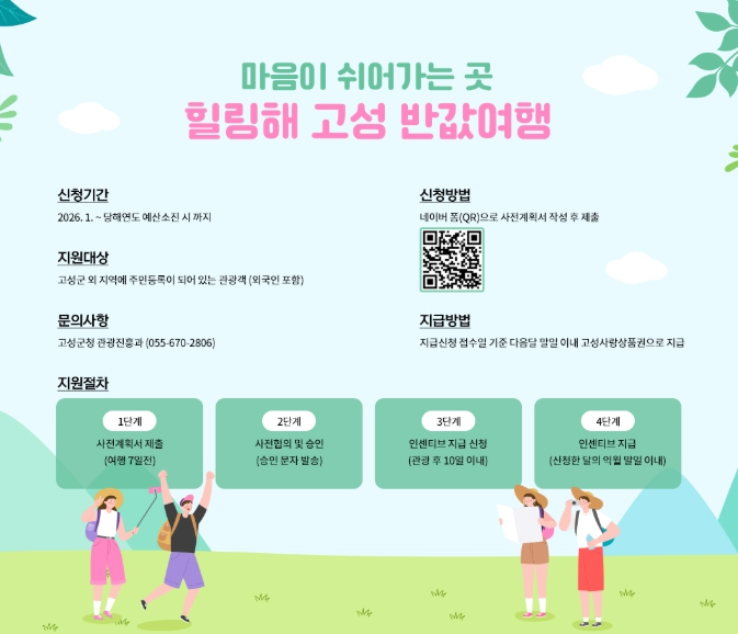 지원 조건은 △1인 3만 원 이상 또는 2인 이상 5만 원 이상 관내 음식점 및 숙박시설 이용 △관광지 2개소(유료 이용시설 1곳 포함) 이상 방문 △전통시장 경유 등이며, 조건 충족 시 관내 여행경비의 50%를 모바일 고성사랑상품권으로 지급한다.