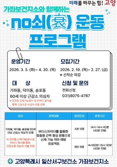 이번 프로그램은 오는 3월 3일부터 4월 30일까지 운영되며, 가좌동, 덕이동, 송포동에 거주하는 60세 이상 주민 중 근감소증 의심자를 대상으로 한다.