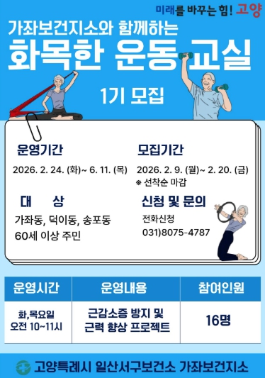 [메이저뉴스]고양특례시 일산서구보건소 가좌보건지소는 지역 어르신들의 건강한 노후를 지원하기 위해 ‘화목한 운동 교실’1기 프로그램 참여자를 모집한다.