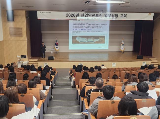 | ▲ 울산지역 학교와 교육기관 산업안전보건 업무 담당자들이 11일 본청 대강당에서 역량 강화 연수를 듣고있다 |