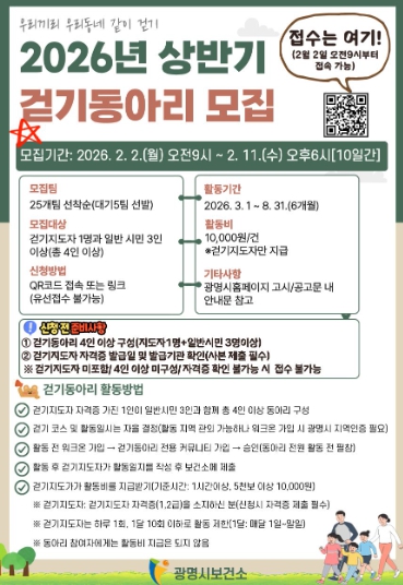 [메이저뉴스]광명시가 시민의 건강 증진과 일상 속 걷기 문화 확산을 위해 오는 2월 2일부터 11일까지 ‘2026년 상반기 걷기동아리’ 참가팀을 모집한다.