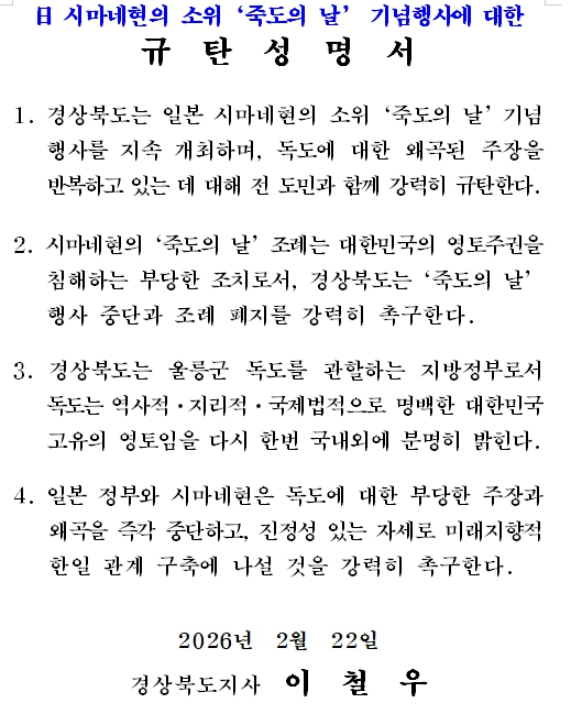 이철우 경북도지사는 “독도는 역사적‧지리적‧국제법적으로 명백한 대한민국 고유의 영토”라고 강조하며, “일본은 독도에 대한 부당한 주장을 즉각 중단하고, 미래지향적인 한일 관계 구축에 책임 있는 자세로 임해야 한다”고 강조했다.