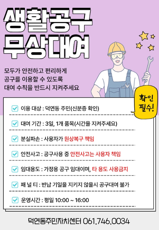 [메이저뉴스]순천시 덕연동 주민자치회(회장 장성욱)는 주민들의 생활 편의를 높이고 공유 및 나눔 문화 확산을 위해 오는 8일부터 ‘생활공구 무상대여 사업’을 운영한다고 밝혔다.
