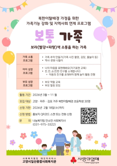 [메이저뉴스]고양시일산종합사회복지관이 북한이탈배경 가정의 가족기능 강화 및 지역사회 통합 프로그램 ‘보통 가족’의 참여자를 이달 18일까지 모집한다.