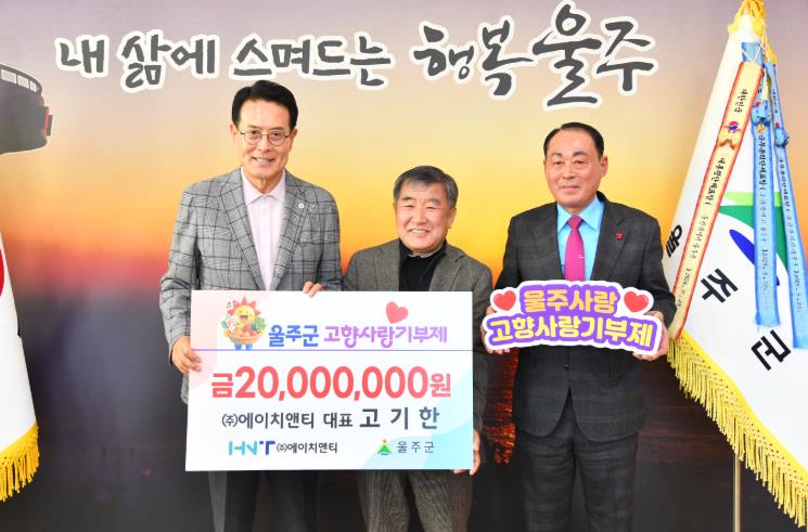 [메이저뉴스]고기한 ㈜에이치앤티 대표가 3일 울주군에 고향사랑기부금 연간 최고액인 2천만원을 전달하면서 4년째 고향사랑을 실천하고 있다.