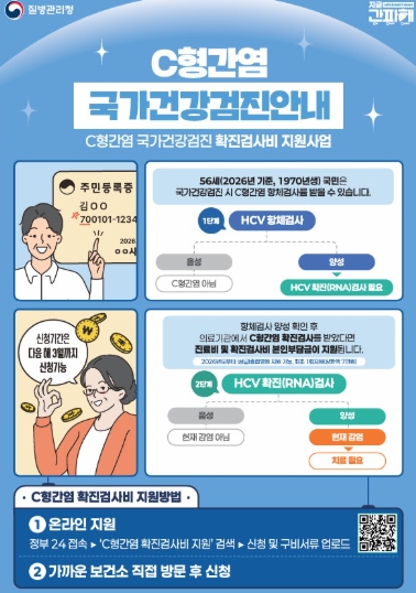 질병관리청은 2026년부터 56세(1970년생)를 대상으로 국가건강검진에서 C형간염 항체 양성 판정을 받은 경우, 확진 검사비 지원 의료기관을 기존 병·의원급에서 상급·종합병원까지 포함한 모든 의료기관으로 확대한다. 지원 항목은 진찰료와 검사비 본인부담금이다. 1회 최대 7만 원을 지원한다.