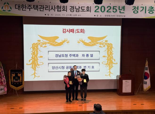 대한주택관리사협회는 양산시의 공동주택 행정의 체계적 개선 노력을 인정해 변기호 공동주택과장에게 감사패를 수여했다.