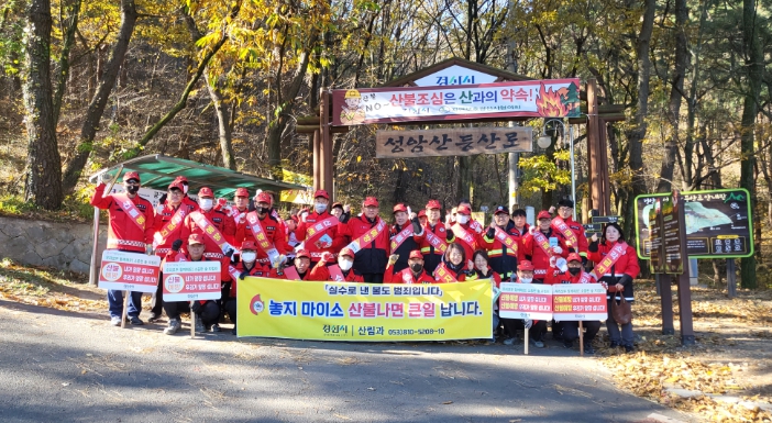 [메이저뉴스]경산시는 가을철 건조한 날씨로 산불 위험이 높아지는 가운데 성암산 입구에서 가을철 산불에 대비하여 산불 예방 캠페인을 실시한다고 밝혔다.