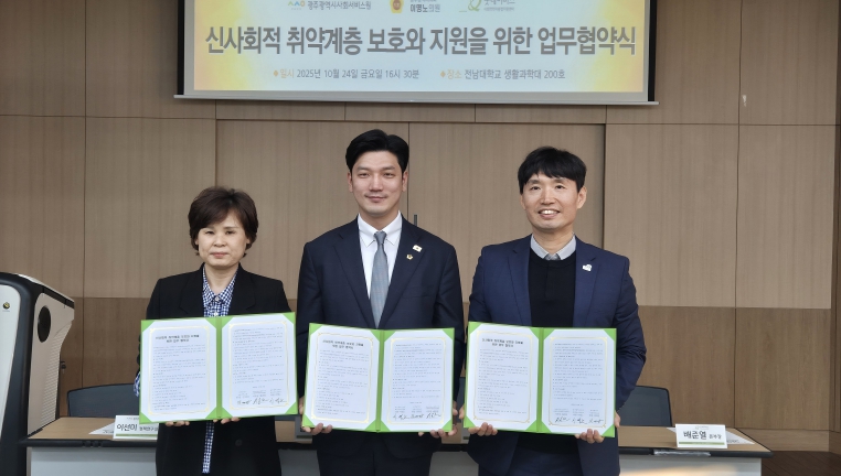 [메이저뉴스]굿네이버스 광주지부(본부장 겸 사회적약자통합지원센터장 배준열)는 광주광역시의회 환경복지위원회 이명노(더불어민주당·서구3) 의원실, 광주광역시사회서비스원(원장 김대삼)과 함께 신사회적 취약계층 보호와 지원 강화를 위한 업무 협약식을 24일 진행했다고 밝혔다.