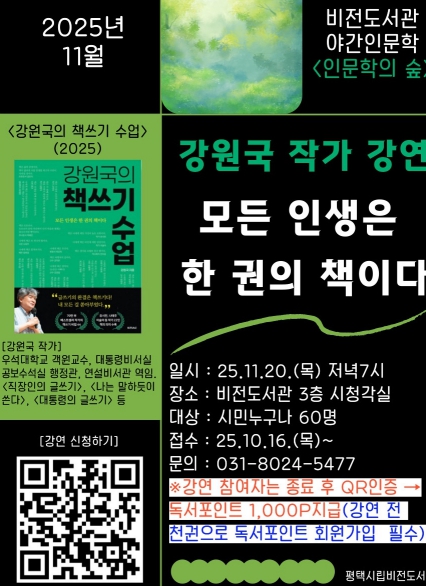 [메이저뉴스]평택시 비전도서관은 오는 11월 20일 저녁 7시 '강원국의 책 쓰기 수업'의 강원국 작가를 초청하여 ‘모든 인생은 한 권의 책이다’를 주제로 야간 인문학 강연을 진행한다.