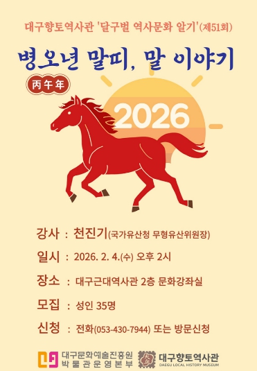 [메이저뉴스]대구문화예술진흥원 박물관운영본부 소속 대구향토역사관은 2026년 병오년 말띠해를 맞아, 2월 4일 오후 2시에 전통 문화 속의 말과 말띠에 대해 살펴보는 제51회 ‘달구벌 역사문화 알기’ 특강을 개최한다.