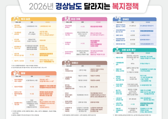 [메이저뉴스]경상남도는 도민복지 향상과 취약계층 사회안전망 강화를 핵심으로 하는 ‘2026년 복지 분야 달라지는 시책’으로 6개 복지분야별 34개의 제도와 지원계획을 발표했다.