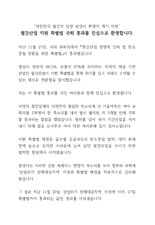 정인화 광양시장은 “광양시 생산의 88.5%, 수출의 97%를 차지하는 철강산업은 광양의 미래이자 대한민국 제조업의 핵심 기반”이라며 “K-스틸법은 철강산업의 경쟁력을 강화하고, 친환경·고부가가치 산업으로의 전환을 가속하는 데 큰 힘이 될 것”이라고 강조했다. 이어 “광양시는 특별법을 새로운 성장의 계기로 삼아 중앙정부와 긴밀히 협력하고, 지역 산업과 경제를 활성화하기 위한 후속 정책을 추진해 나가겠다”고 밝혔다.