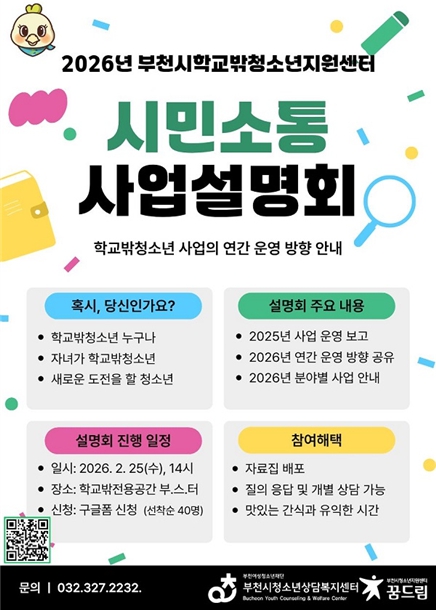 [메이저뉴스] 부천시학교밖청소년지원센터는 오는 2월 25일, 오후 2시 학교밖청소년 전용공간 부.스.터. (송내어울마당 1층)에서 시민과의 소통을 확대하고 2026년 연간 운영계획을 공유하는 ‘사업설명회’를 개최한다고 밝혔다.