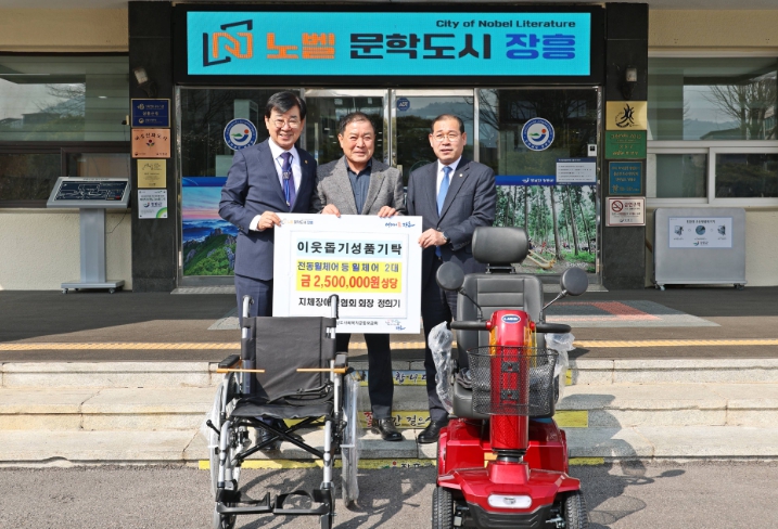 [메이저뉴스]장흥군은 20일 정희기 장흥군지체장애인협회 회장이 지역 내 거동이 불편한 군민을 위해 250만 원 상당의 전동휠체어 및 낙상방지용 휠체어 총 2대를 기탁했다고 밝혔다.