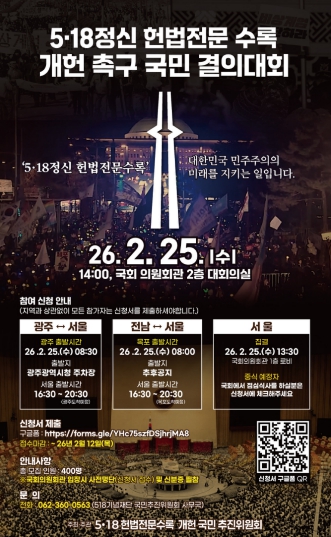 이날 행사에는 추진위원회 상임·공동대표와 전국 시민사회 활동가 등이 참석해 기조발언, 지지연설, 특별강연, 결의문 낭독 등을 통해 5·18정신 헌법전문 수록의 필요성과 당위성을 공유할 예정이다.