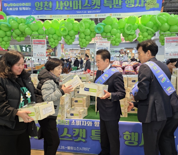 시는 샤인머스캣 과잉 공급에 대응하고 지역 농산물 소비 촉진 및 농업 상생 문화 확산을 위해, 지난 9월 전국 하나로마트에서 샤인머스캣 30톤을 완판한 데 이어 10월에는 전국 롯데마트·롯데슈퍼 328개 지점과 이마트 132개 지점에서 진행한 영천포도 축제에서도 준비 물량 207톤을 모두 판매하는 성과를 거뒀다.