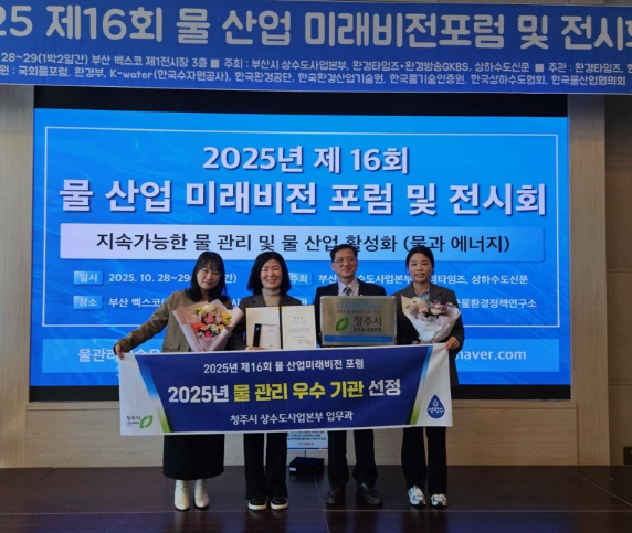 [메이저뉴스]청주시 상수도사업본부는 28일 부산 벡스코에서 개최된 ‘제16회 물 산업미래 비전 포럼’에서 ‘물 관리 우수기관’으로 선정돼 상을 받았다.