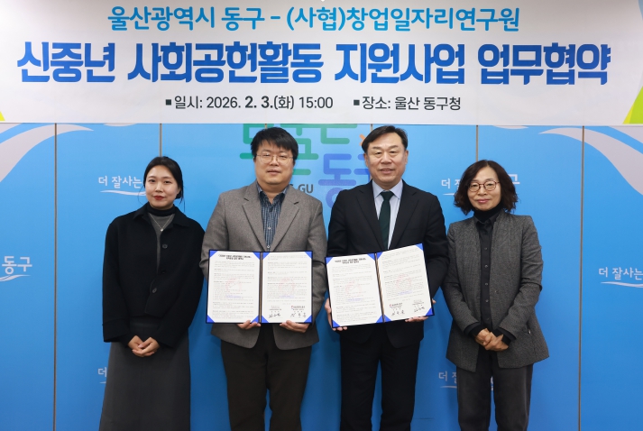 동구는 2월 3일 오후 3시 구청장실에서 (사협)창업일자리연구원(대표 김은석)과 ‘2026년 신중년 사회공헌활동 지원사업’ 추진을 위한 업무 협약을 체결했다.