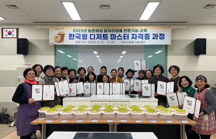 [메이저뉴스]구미시는 농촌여성의 경제활동 참여 확대와 일자리 창출을 목표로 올해 상·하반기 전문기능교육을 운영해 ‘노인실버건강지도사’와 ‘한국형 디저트 마스터’ 2개 자격증 과정을 성공적으로 마무리했다.