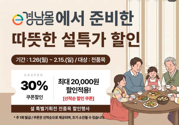 [메이저뉴스]경상남도와 (재)경상남도투자경제진흥원이 운영하는 e경남몰은 1월 26일부터 예산 소진 시까지 ‘2026년 풍성한 설맞이 할인 기획전’을 진행한다.