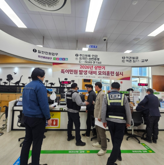 [메이저뉴스]고성군은 1월 29일 군청 열린민원과에서 고성경찰서와 연계하여'2026년 상반기 특이민원 대응 모의훈련'을 실시했다.