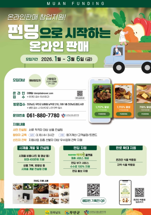 [메이저뉴스]무안군은 지역산업 맞춤형 일자리 창출의 일환으로 ‘펀딩을 통한 상품개발 및 판매경험(식품) 창업 지원사업’ 참여자를 오는 3월 6일까지 모집한다고 밝혔다.