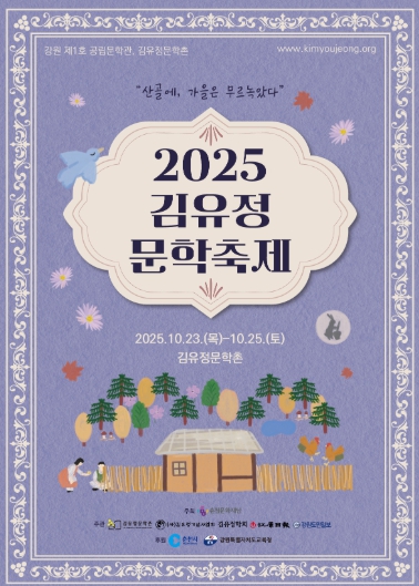 24일에는 제19회 김유정문학상 시상식이 열린다. 올해 수상자는 소설가 이주란, 수상작은 단편 ‘겨울정원’이다. 같은 날 열리는 어린이 그림 대회 ‘유정다정’은 문학촌의 가을 풍경을 배경으로 아이들이 상상력과 감성을 키운다. 마지막 날 25일에는 ‘김유정학술대회’와 ‘김유정학술상’ 시상식이 이어지며 김유정 문학의 동시대적 의미를 학문적으로 조명한다. 또 국악, 합창, 창작공연이 어우러진 공연마당이 열려 축제의 피날레를 장식한다.