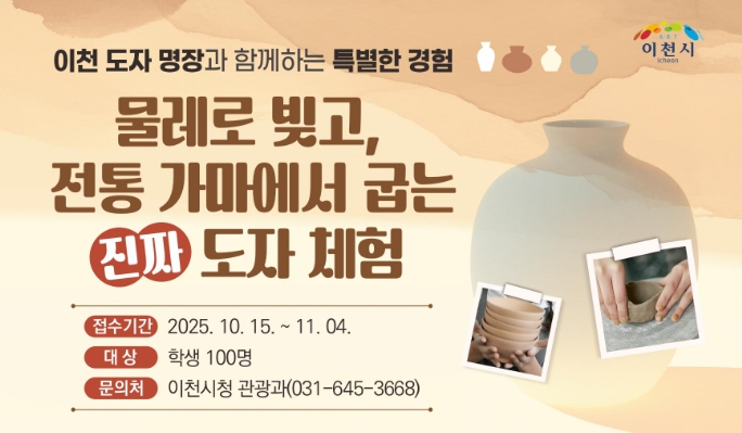 이번 프로그램은 학생들이 흙을 만지고 불의 예술을 배우며 전통 도자문화의 매력을 느낄 수 있도록 마련된 교육형 문화체험 행사로, 이천 도자 명장과 지역 도예인이 직접 지도한다.