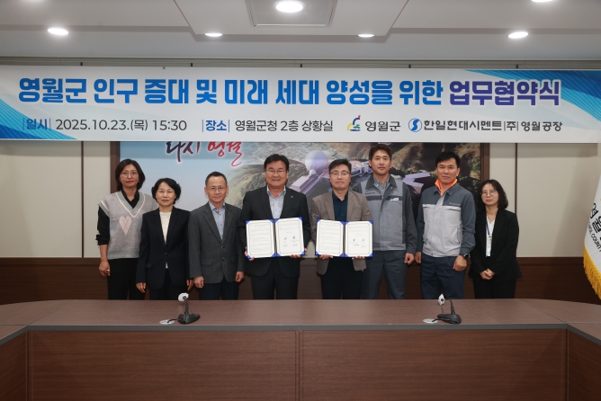 [메이저뉴스] 영월군은 23일 한일현대시멘트(주) 영월공장(공장장 허권회)과 인구 증대 및 미래 세대 양성을 위한 업무 협약을 체결했다고 밝혔다.